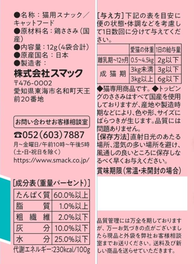 ●トッピングのささみはすべて国産を使用しておりますが、産地や製造時期などにより、色や形、サイズにばらつきが生じます。品質には問題ありません。