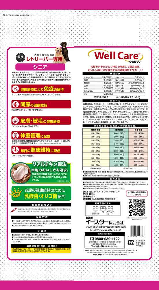 たんぱく質…24.0%以上、脂質…9.5%以上、粗繊維…4.5%以下、灰分…9.0%以下、水分…10.0%以下、カルシウム…1.0%以上、リン…0.8%以上、ナトリウム…0.2%以上、リノール酸…1.1%以上、ビタミンA…12、000IU/kg以上、ビタミンE…280IU/kg以上、ビタミンB1…4.0mg/kg以上、ビタミンB2…6.5mg/kg以上、