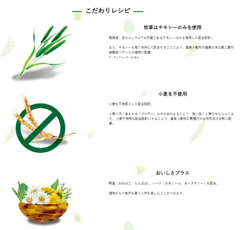 牧草は高繊維・低カルシウムなチモシーのみを使用し、お腹と泌尿器の健康を維持します。