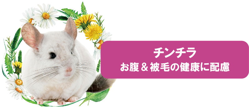 獣医師と共同開発したお腹と被毛の健康維持に集中配慮されたチンチラ用の主食。 【牧草はチモシーのみ使用】 牧草は高繊維・低カルシウムなチモシーのみを使用し、お腹と泌尿器の健康を維持します。 食物繊維により、毛球の形成を抑えるとともに体内からの毛球排泄を促します。 また、食物繊維による健康な腸運動の維持をサポート。 ※高繊維・低カルシウム:アルファルファ牧草比 【お腹の健康維持】 毛球形成の一因ともいわれる小麦を不使用としたレシピ。 また、オリゴ糖・乳酸菌・ビフィズス菌を配合。 【被毛の健康維持】 月見草オイル、コラーゲン、アミノ酸、ビタミン類(A、E、B群、C、E)、亜鉛を配合することにより、チンチラのふわふわな被毛の健康維持に配慮。