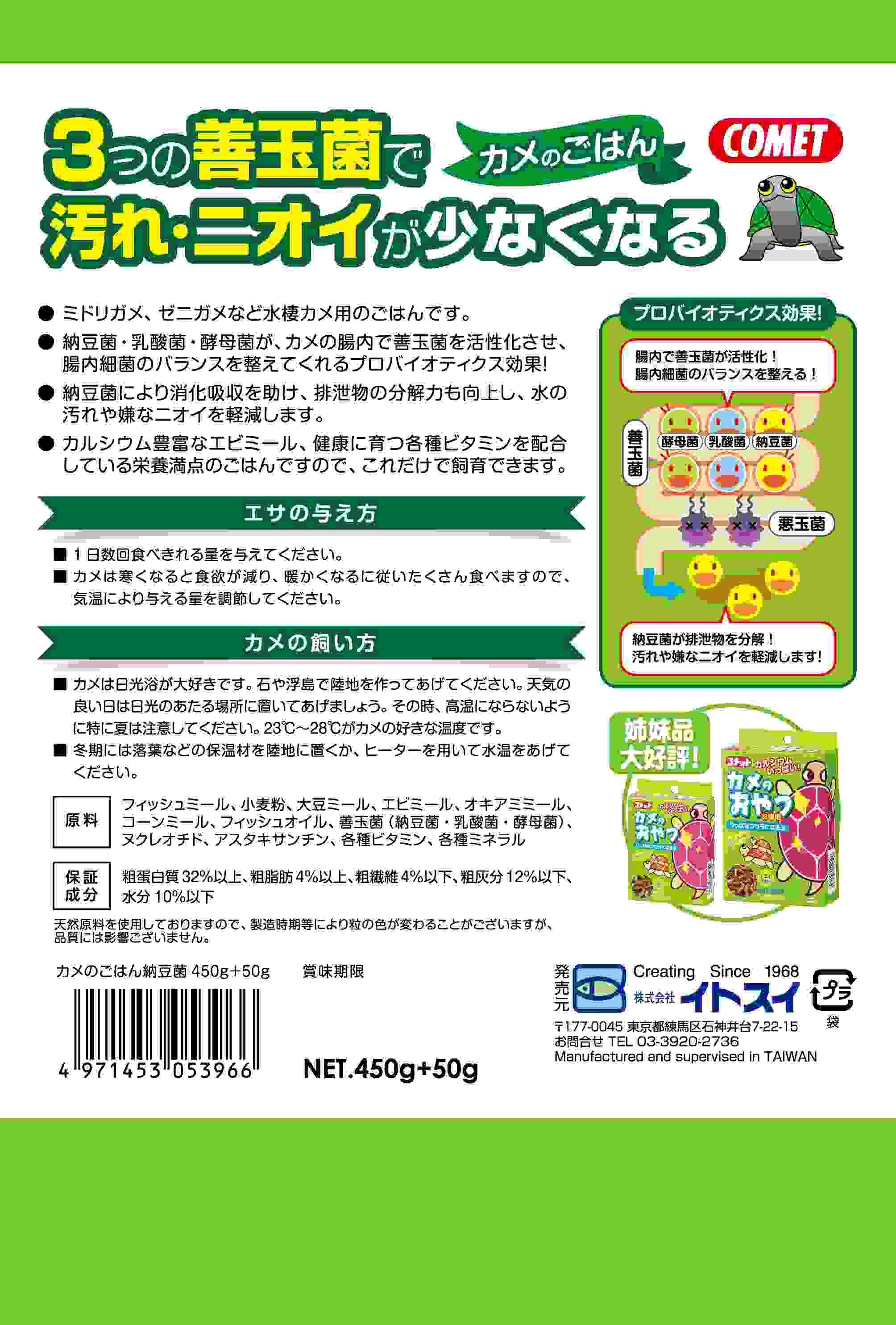 納豆菌の力で、水の汚れをおさえ、嫌なニオイを減らすカメのごはん。