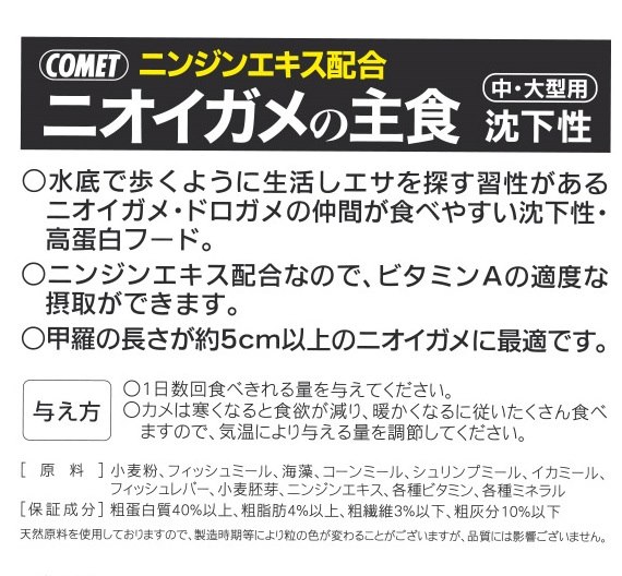ニンジンエキス配合ですので、カメにとって大切なビタミンAを適度に摂取出来ます。ニオイガメは水底で歩くようにエサを探す習性がある為、食べやすい沈下性・高たんぱくのフードに仕上げています。