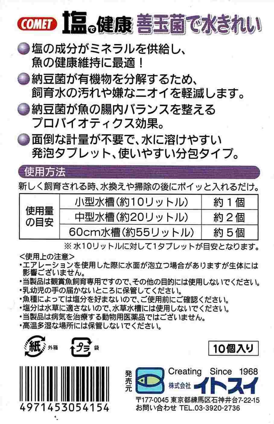塩の成分がミネラルを供給し、魚の健康維持。納豆菌が魚の腸内バランスを整えるプロバイオティクス効果。