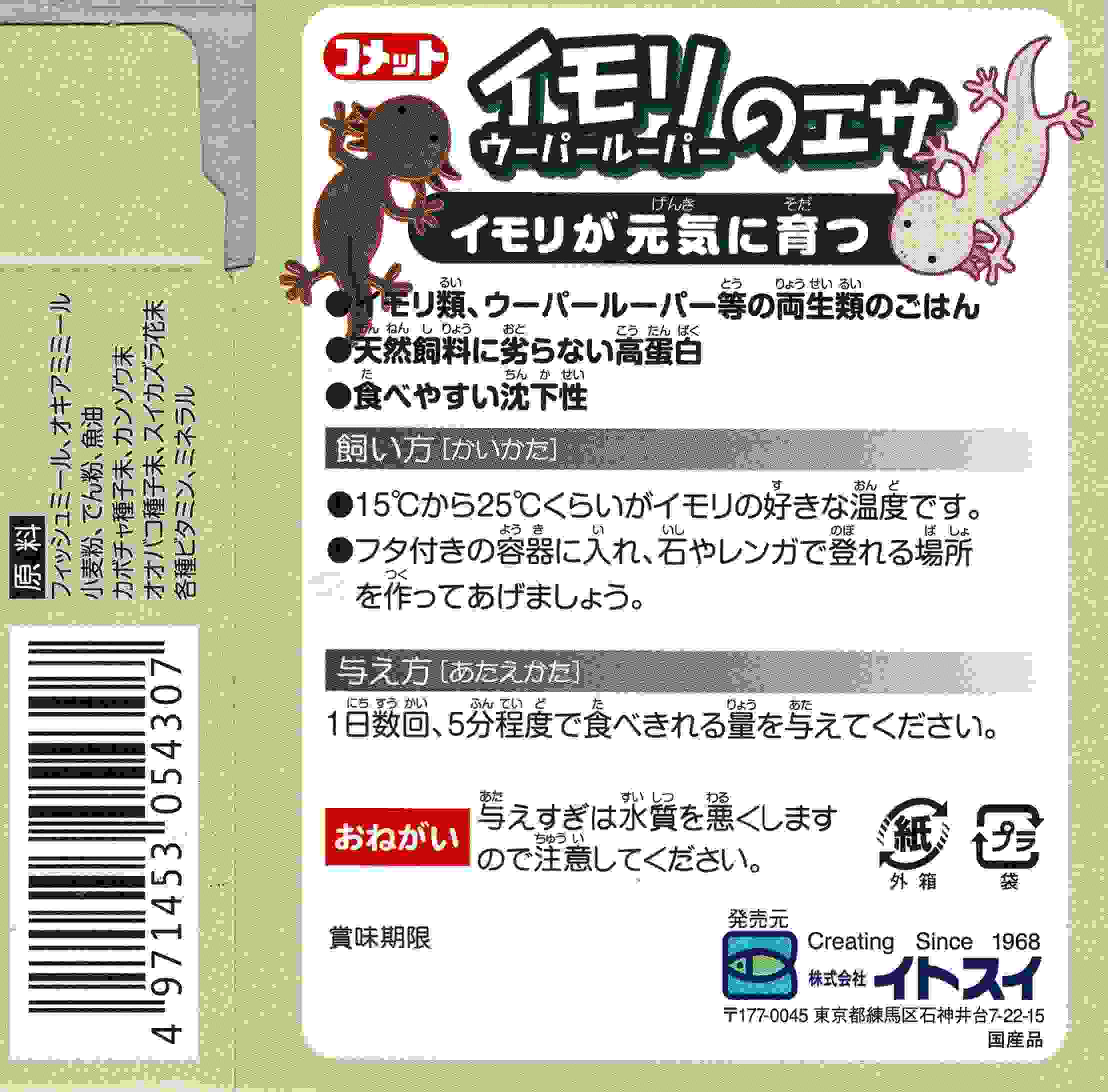 アカハライモリ・シリケンイモリ・ウーパールーパー等の両生類用飼料。天然飼料に劣らない高タンパク、オキアミミールを強化配合した高嗜好性フード。両生類が食べやすい沈下性タイプです。