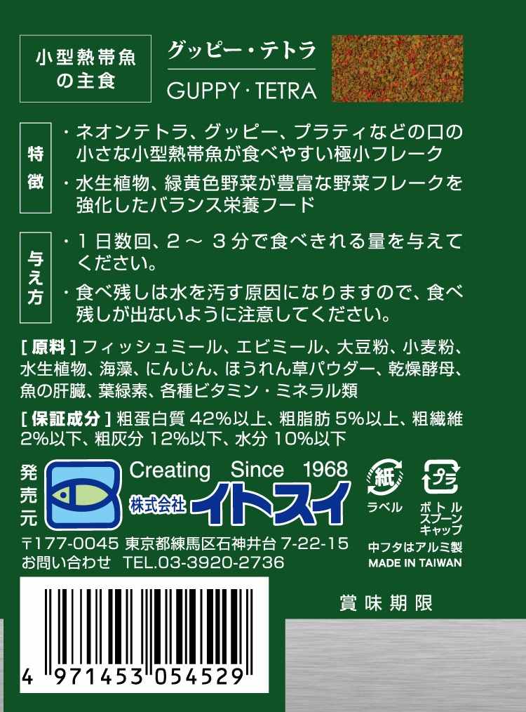 フィッシュミール、エビミール、大豆粉、小麦粉、水生植物、海藻、にんじん、ほうれん草パウダー、乾燥酵母、魚の肝臓、葉緑素、各種ビタミン、各種ミネラル