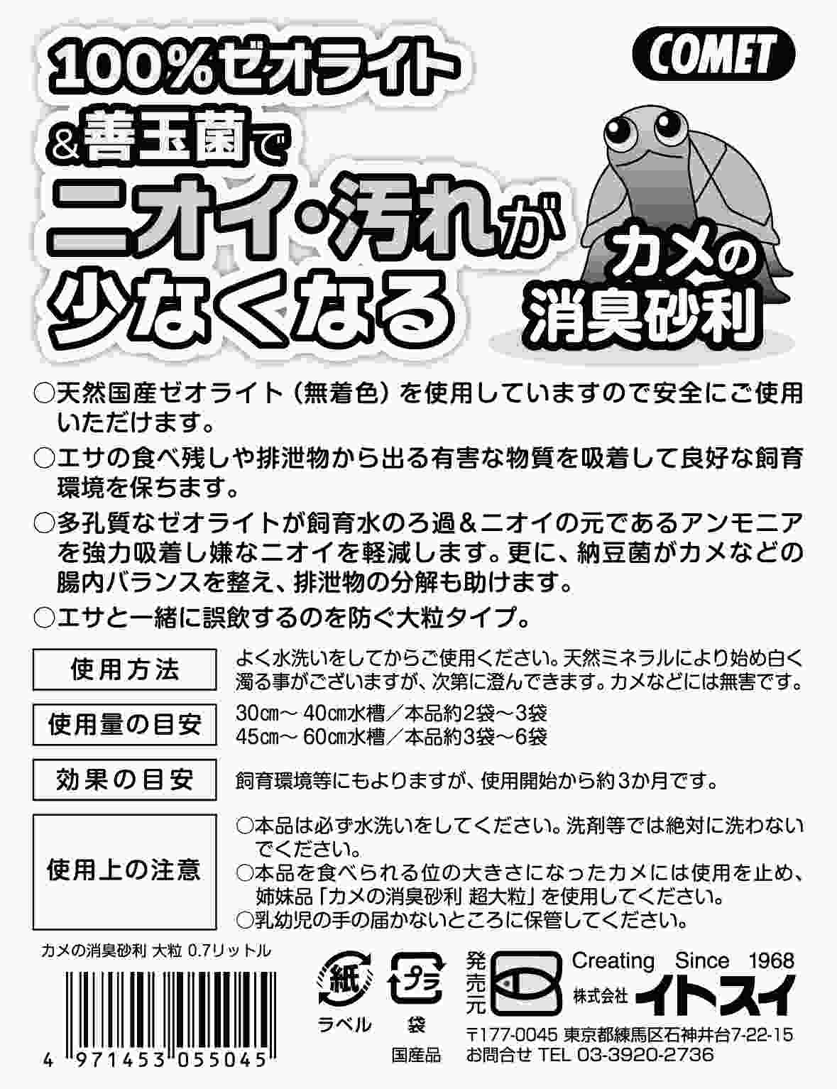 天然国産ゼオライト(無着色)を使用。エサの食べ残しや排泄物から出る有害な物質を強力吸着し、嫌なニオイを軽減します。良好な飼育環境を保つ効果があります。誤飲を防ぐ大粒サイズ(一粒約8~20mm)と超大粒サイズ(一粒約45~55mm)です。