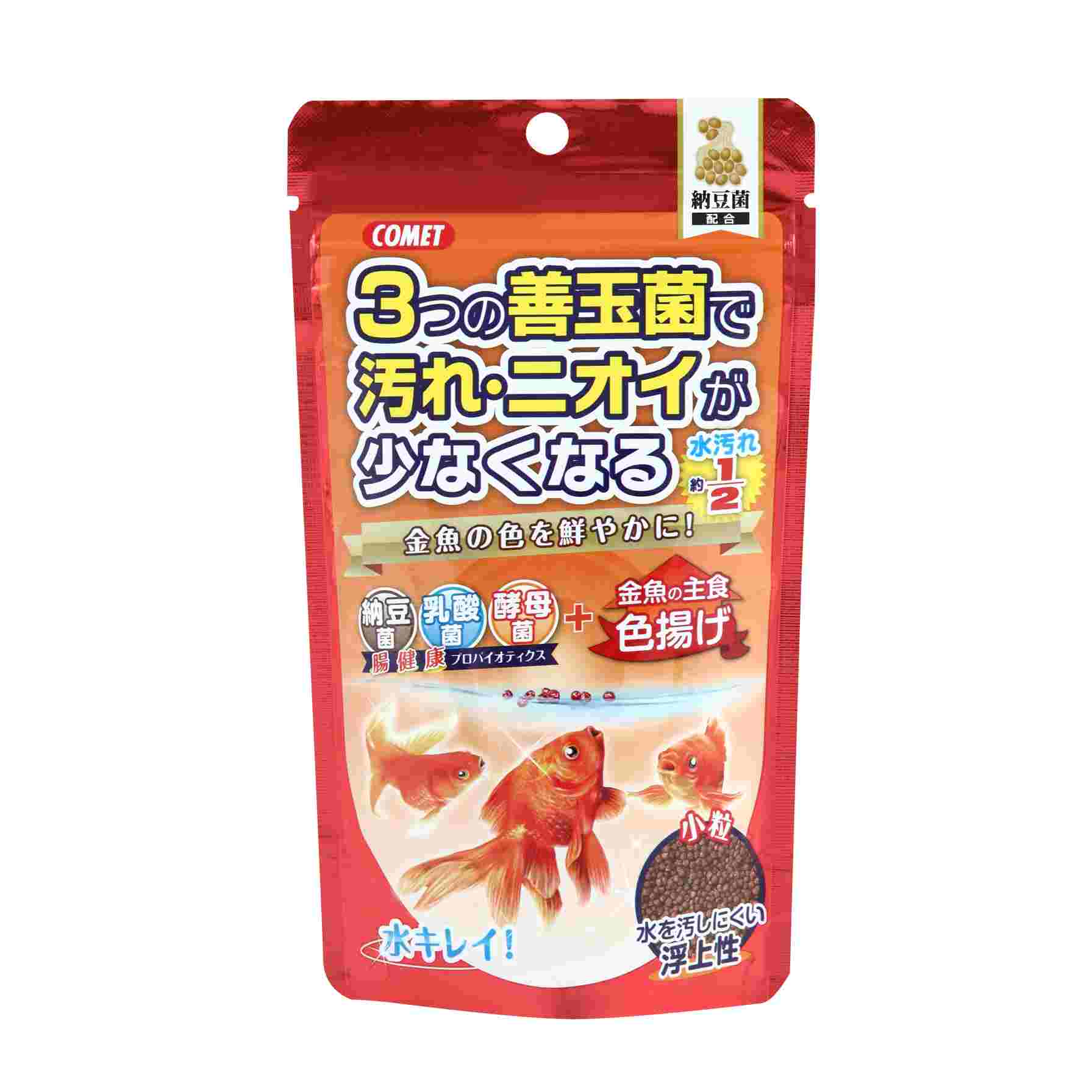 納豆菌・乳酸菌・酵母菌の3つの善玉菌の力で金魚の腸内細菌のバランスを整え、水の汚れや嫌なニオイを減らします。更に金魚の色を鮮やかにするカロチノイド配合の色揚げ用栄養フード。小粒タイプ。