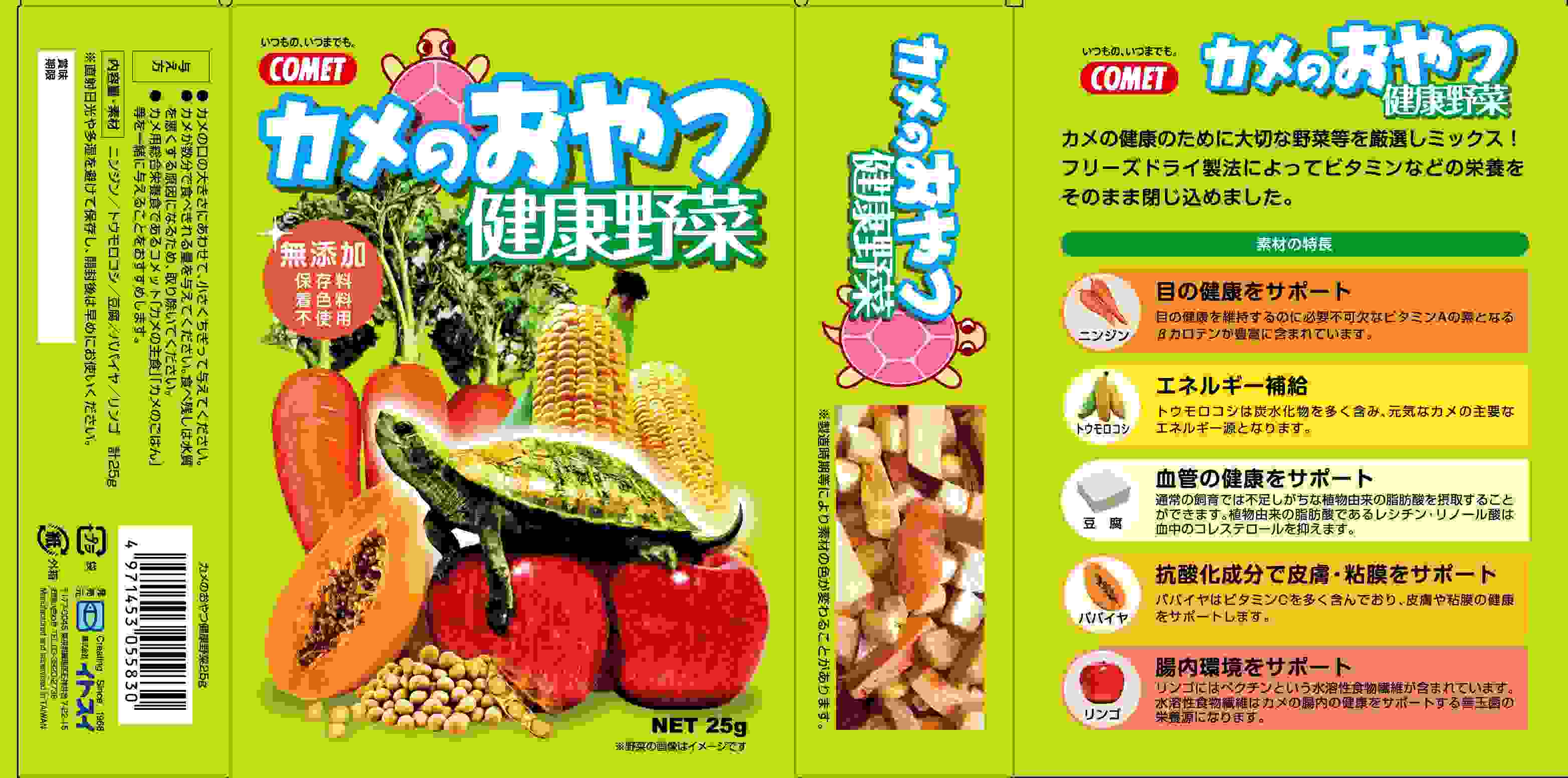〇カメの健康をサポート(5種類の野菜・果物)〇リンゴ、パパイヤ、にんじん、とうもろこし、豆腐をフリーズドライにしました。〇十数種類の素材を試し、嗜好性が良く、浮上するものを選定しました。