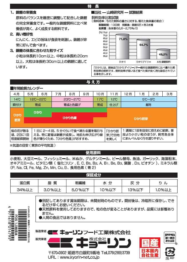 良質原料をバランスよく配合、丈夫で美しい錦鯉に育ちます。