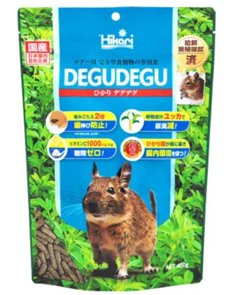 こだわりの硬さでデグーの歯伸び防止。尿臭を抑えるユッカ、ひかり菌配合で腸内環境を保つ。糖類不使用。