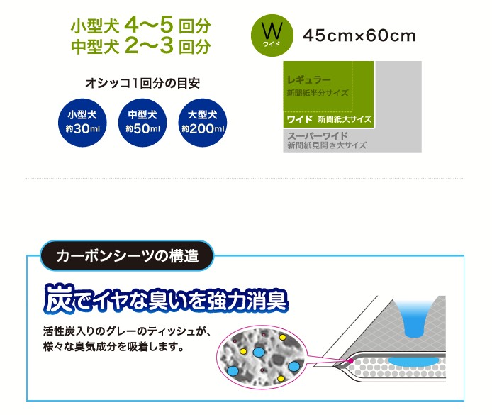 ***強力吸着消臭***炭でイヤな臭いを強力に吸着消臭するため、室内を快適に保ちます。***瞬間スポット吸収***オシッコをスピード吸収し、広がりを抑えます。***足濡れ防止***オシッコの逆モレを抑え、表面はいつもサラサラで足漏れを防ぎます。<原材料>表面材:ポリオレフィン不織布吸水材:綿状パルプ、カーボン紙(炭)、吸水性ポリマー 防水材:ポリエチレンフィルム 結合材:ホットメルト<内容量> 2220g<原産国> 日本