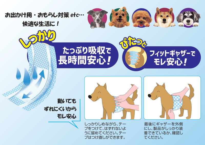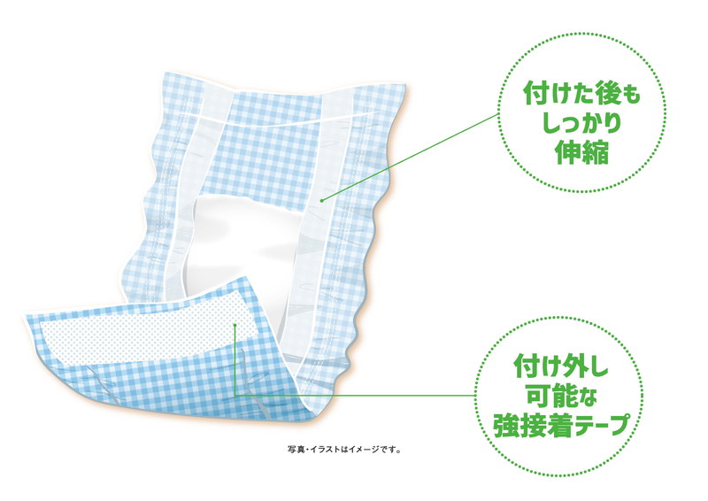 ★ウエストギャザー★ 動いても収縮性ギャザーでしっかりフィット。 ★強接着テープ★ 何度も付け直しができて、ずれない強接着テープ採用。 ★厚手の吸収体★ しっかりした厚手の吸収体で、たっぷり吸収するから長時間安心!