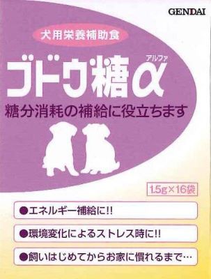 幼犬は移動中、移動後などの不慣れな環境ではエネルギーの補給が必要です。「ブドウ糖α」は糖だけでなく、アミノ酸やビタミン、ビール酵母を含有し、飼いはじめてからお家に慣れるまで、環境変化に慣れるまで、激しい運動の前後など体内に糖を補給したいときに与えると効果的です。