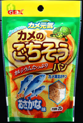 カメが大好きな素材を厳選した、手でちぎって与えられる栄養満点のおやつ。お魚入り。