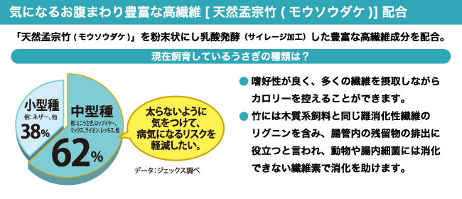 天然孟宗竹(モウソウダケ)を粉末化+乳酸発酵(サイレージ加工)した高繊維成分をプラス配合。