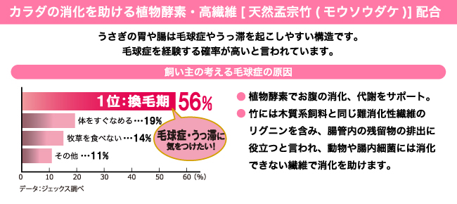うさぎさんの胃腸は毛球症やうっ滞を起こしやすい構造。消化を助ける植物酵素と排出を助ける高繊維成分[孟宗竹(モウソウダケ)]を配合。お腹の消化と代謝をサポートします。