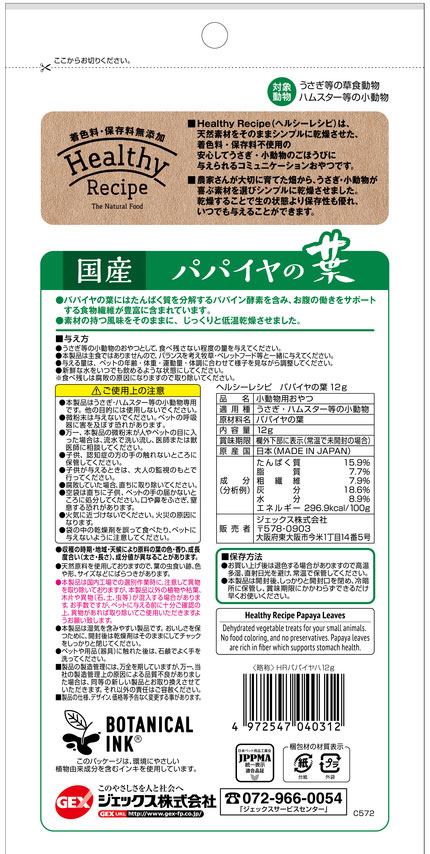 ●ヘルシーレシピは、天然素材をそのままシンプルに乾燥させた、着色料・保存料不使用の安心してうさぎ・小動物のごほうびに与えられるコミュニケーションおやつです。●農家さんが大切に育てた畑から、うさぎ・小動物が喜ぶ素材を選びシンプルに乾燥させました。乾燥することで生の状態より保存性も優れ、いつでも与えることができます。●パパイヤの葉にはたんぱく質を分解するパパイン酵素を含み、お腹の働きをサポートする食物繊維が豊富に含まれています。●素材の持つ風味をそのままに、じっくりと低温乾燥させました。