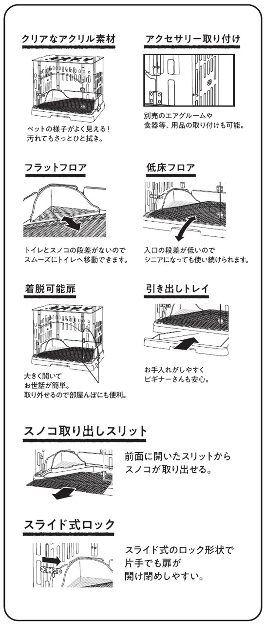 ●汚れてもさっとひと拭き。●トイレとスノコの段差がないのでトイレへの移動もスムーズ。●入口の段差が低いのでシニアになっても使い続けられます。●着脱可能扉は大きく開いてお世話が簡単で、取り外せるので部屋んぽにも便利。●引き出しトレイ付でお手入れがしやすくビギナーさんも安心。<組立時サイズ> 幅70×奥行55×高さ58.5㎝(キャスター装着時)<組立時サイズ> 約70×55×58.5cm(キャスター装着時)<個装サイズ/重量> 幅730×奥行580×高さ260mm/12,500g
