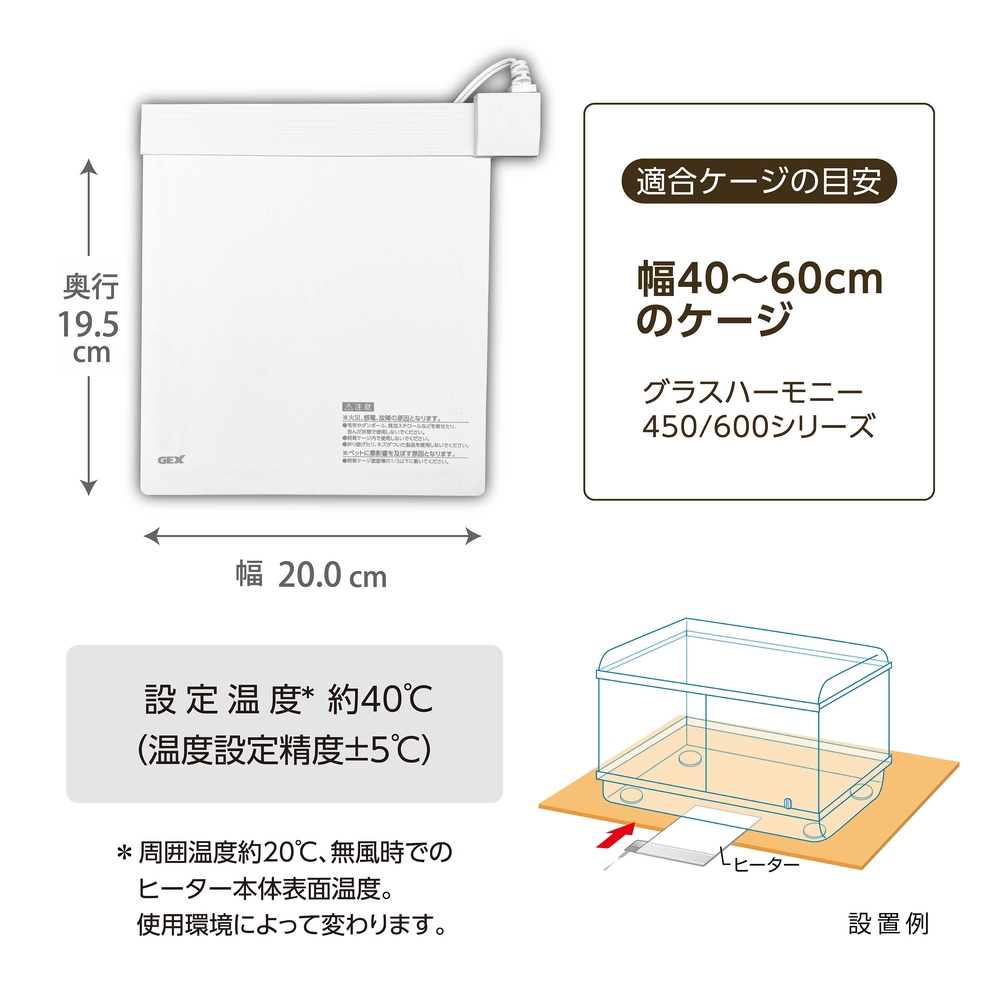 ケージの下に敷くだけカンタン!かじられず安心・汚れにくく清潔な薄型ヒーター。【ペットを守る安全設計】1.丈夫な6層構造設計で、ヒーター層がしっかり保護されているので傷つきにくい。特許取得のPTC塗料を含浸焼成した特殊ファイバーを採用。2.自動でヒーター温度を一定に保てる、自己温度制御(PTC)ヒーターを採用。異常発熱時は電流ヒューズが通電を遮断するので、もしもの時も安心。・コンセントに差してケージの下に敷くだけのカンタン設置。ケージの外に設置するのでペットにかじられる心配がなく、汚れにくいので清潔にご使用いただけます。熱をペットに直接当てずにやさしく保温するので、低温やけどなどの心配も不要です。・表裏どちら向きでも使用できるので、コンセントに無理なく接続できます。・小鳥のヒナにも!・省エネ 電気代:1日あたり約6.5円(1kWh 27円の場合)・適合ケージの目安:幅40~60cmのケージ