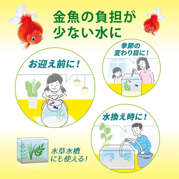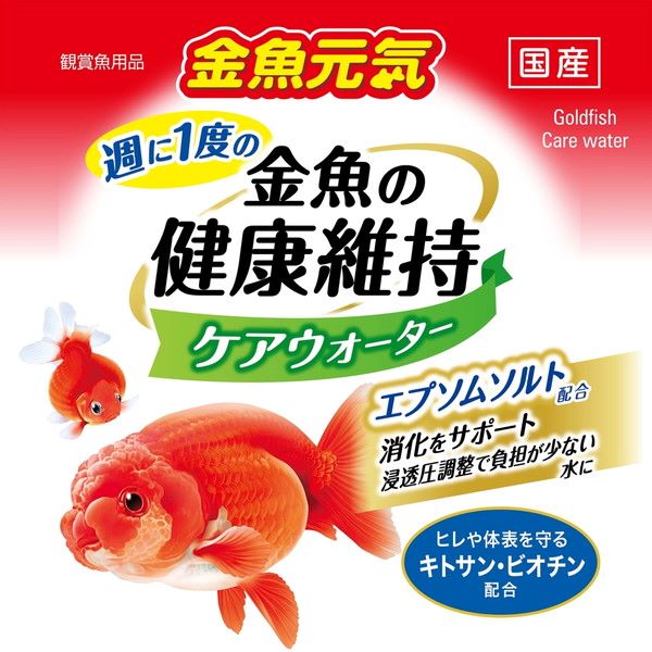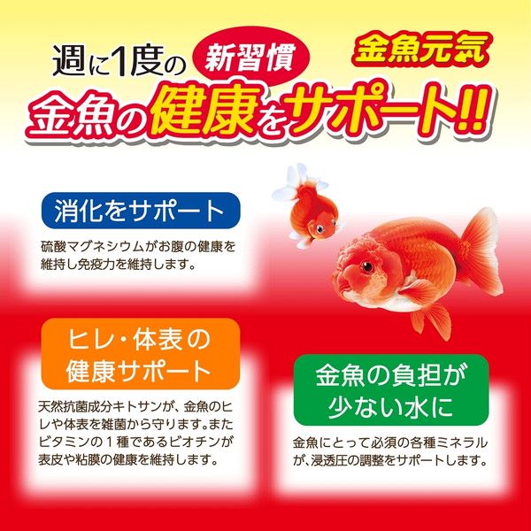 エプソムソルト(硫酸マグネシウム)配合で金魚の強さを引き出す水に。◎消化をサポート・金魚を消化器官が未熟のため、環境変化によるストレスを受けると消化不良による免疫低下により体調を崩しやすくなります。・お腹の健康を維持することにより免疫力を維持します。◎金魚の負担が少ない水に・各種ミネラル配合で浸透圧バランスをサポートし、金魚に負担をかけない快適な環境を保ちます。・天然抗菌成分キトサン・ビオチン配合で、金魚のヒレや体表を雑菌から守ります。・小さな水槽でも使いやすい、便利な計量キャップ付き。・水草にも安心してお使いいただけます。