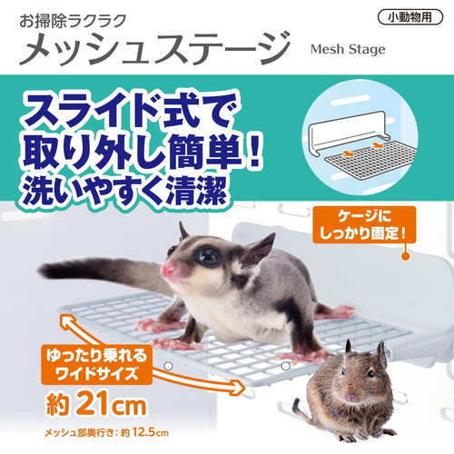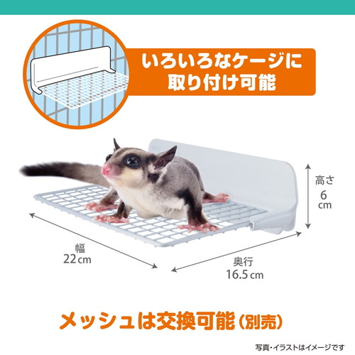 スライド式で取り外し簡単!洗いやすく清潔なワイヤーメッシュのステージです。・約21cmのワイドサイズだから、フクロモモンガやデグーもゆったり乗ることができます。・ケージにしっかり固定!・メッシュ部奥行き約12.5cm・いろいろなケージに取り付け可能・メッシュは交換可能(別売)・メッシュはスライド式で取り外し簡単、お掃除しやすいステージです・金属製だから汚れにくく、丸洗いもできるので清潔に保てます