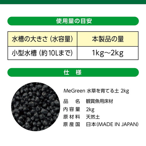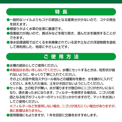 すばやく根が張るタイプ。吸着力が高く澄んだ水が続く。特長・一般的なソイルよりもコケの原因となる窒素分が少ないので、コケの発生を抑えます。・根張りがよく水草の生育に最適です。・吸着能力が高いので、黄ばみなどを取り除き、澄んだ水を維持することができます。・浄水処理過程で出てくる本来廃棄されている泥や土などの浮遊物質を造粒して再利用した、地球にやさしい土です。