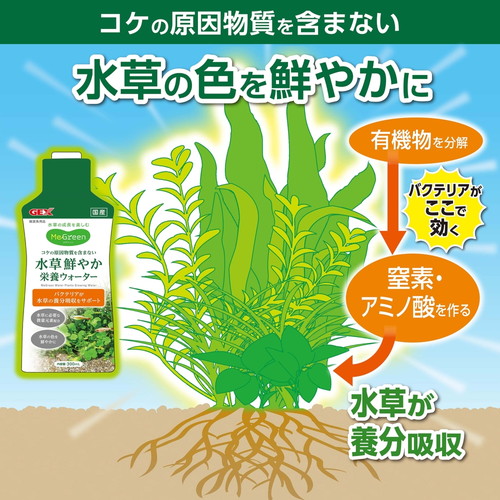 天然バクテリア作用を活かして水草を美しく育成。バクテリアが水草の養分吸収をサポート。水草の色を鮮やかに。特長・コケの原因物質である養分を含まないので、水質悪化やコケの発生が起きにくく、水草に安心してお使いいただける栄養剤です。・バチルス属バクテリアが生きたまま入っているので、水槽内の有機物を分解し、窒素やアミノ酸を作ることで水草が養分を効率的に吸収することができます。・水草に必要な微量元素をイオン化しているので、水草がすぐに利用することができます。
