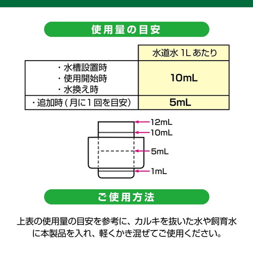 使用量目安・水槽設置時、使用開始時、水換え時:水道水1Lあたり10mL・追加時(月に1回を目安):水道水1Lあたり5mL