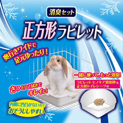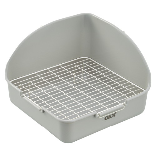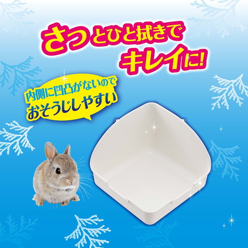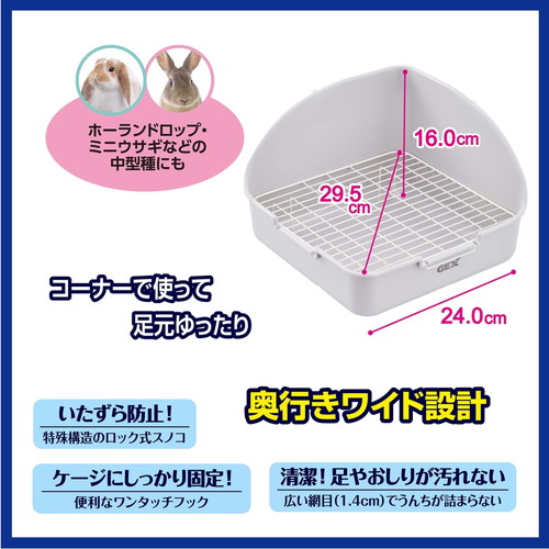 お部屋に溶け込む落ち着いたムーングレーのうさぎ用トイレ・奥行きワイドで足元ゆったり!・いたずら防止!特殊構造のロック式スノコ・ケージにしっかり固定!便利なワンタッチフック・足やおしりが汚れず清潔!うんちが詰まりにくい広い網目(1.4cm)・サッとひと拭きでキレイ!内側に凹凸がないのでおそうじしやすい・ホーランドロップ、ミニウサギなどの中型種にも・一緒に使って、もっと消臭!ラビレット ヒノキア消臭砂&三角トイレシーツ付
