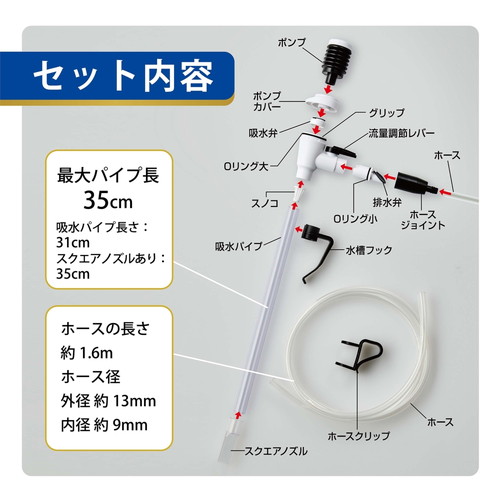 ・長めのパイプなので、底砂がたっぷり入った水槽でも奥までしっかり差し込んで、底砂の中まで掃除ができます。