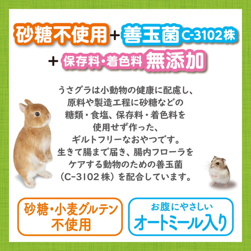 ●うさグラは小動物の健康に配慮し、原料や製造工程に砂糖などの糖類・食塩、保存料・着色料を使用せず作った、ギルトフリーなおやつです。