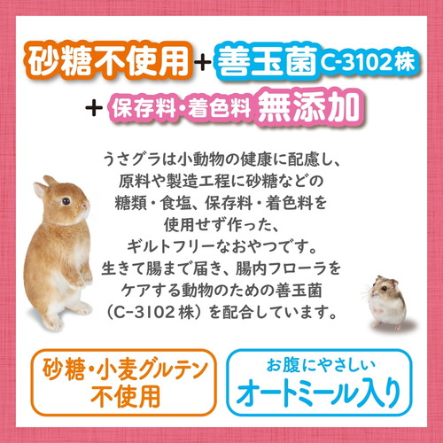 ●うさグラは小動物の健康に配慮し、原料や製造工程に砂糖などの糖類・食塩、保存料・着色料を使用せず作った、ギルトフリーなおやつです。