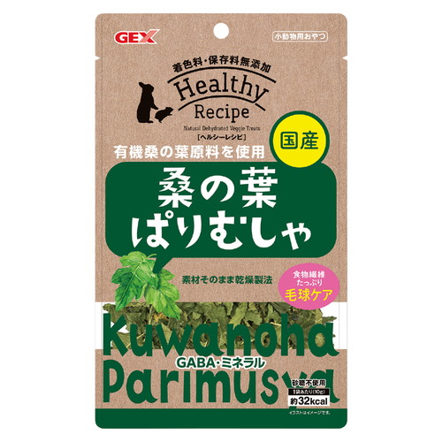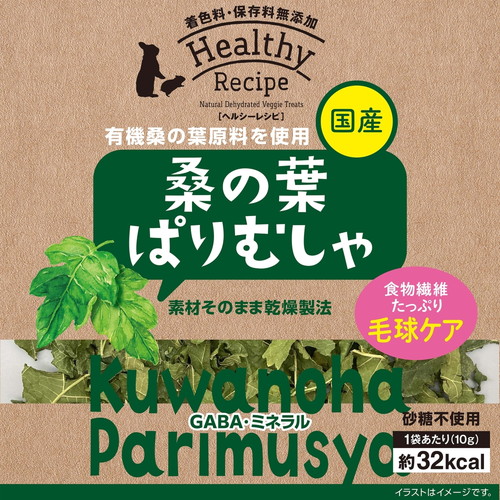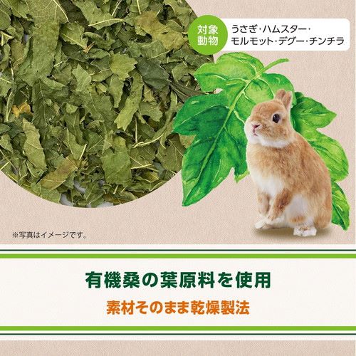 国内で手摘みと無農薬にこだわって大切に育てられた、国産有機桑の葉原料を使用。桑はクワ科の広葉樹で、葉の部分にはGABAやミネラルなどの栄養素が豊富に含まれており、嗜好性も抜群の素材です。●Healthy Recipe(ヘルシーレシピ)は、天然素材をそのままシンプルに乾燥させた、砂糖・着色料・保存料不使用の、安心してうさぎや小動物に与えられるおやつです。●国産●GABA、ミネラル●食物繊維たっぷり毛球ケア