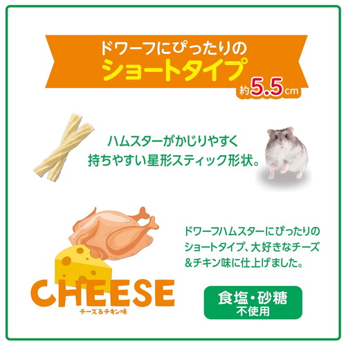 ●ドワーフハムスターにぴったりのショートタイプ、大好きなチーズ&チキン味に仕上げました。