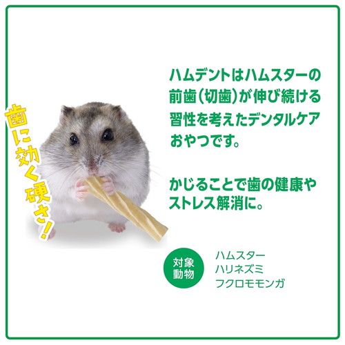 ●ハムデントはハムスターの前歯(切歯)が伸び続ける習性を考えたデンタルケアおやつです。かじることで歯の健康やストレス解消に。