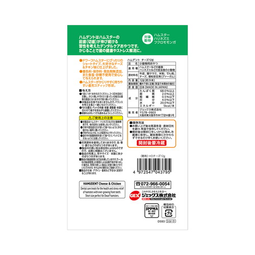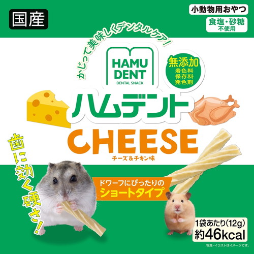 かじって美味しくデンタルケア!ドワーフにぴったりのショートタイプ。●ハムデントはハムスターの前歯(切歯)が伸び続ける習性を考えたデンタルケアおやつです。かじることで歯の健康やストレス解消に。●ドワーフハムスターにぴったりのショートタイプ、大好きなチーズ&チキン味に仕上げました。●歯に効く硬さ!●国産●着色料・保存料・発色剤無添加、また食塩・砂糖不使用で安心して与えられます。●ハムスターがかじりやすく持ちやすい星形スティック形状。