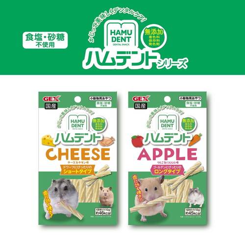 かじって美味しくデンタルケア!ゴールデンにぴったりのロングタイプ。●ハムデントはハムスターの前歯(切歯)が伸び続ける習性を考えたデンタルケアおやつです。かじることで歯の健康やストレス解消に。●ドワーフハムスターにぴったりのショートタイプ、大好きなチーズ&チキン味に仕上げました。●歯に効く硬さ!●国産●着色料・保存料・発色剤無添加、また食塩・砂糖不使用で安心して与えられます。●ハムスターがかじりやすく持ちやすい星形スティック形状。