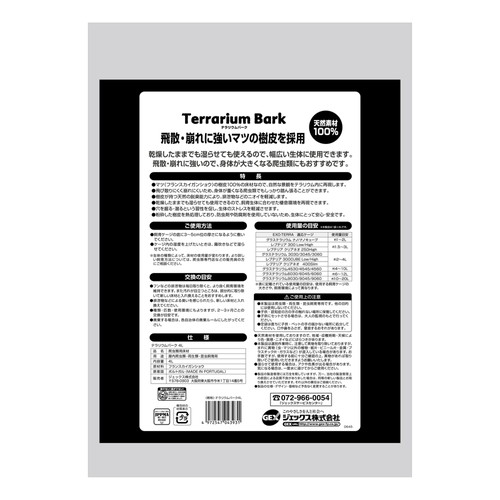 飛散・崩れに強いマツの樹皮を採用した床材。身体が大きくなる生体におすすめ。樹皮の脱臭能力で排泄物のニオイを軽減。乾燥したままでも湿らせても使用できるので、飼育生体に合わせた棲息環境を再現できます。天然フランスカイガンショウ100%。●マツ(フランスカイガンショウ)の樹皮100%の床材なので、自然な景観をテラリウム内に再現します。●飛び散りにくく崩れにくいため、身体が重くなる爬虫類でもしっかり踏ん張ることができます。●樹皮が持つ天然の脱臭能力により、排泄物などのニオイを軽減します。●乾燥したままでも湿らせても使用できるので、飼育生体に合わせた棲息環境を再現できます。●穴を掘る・潜るという習性を促し、生体のストレスを軽減させます。●粉砕した樹皮を熱処理しており、防虫剤や防腐剤を使用していないため、生体にとって安心・安全です。