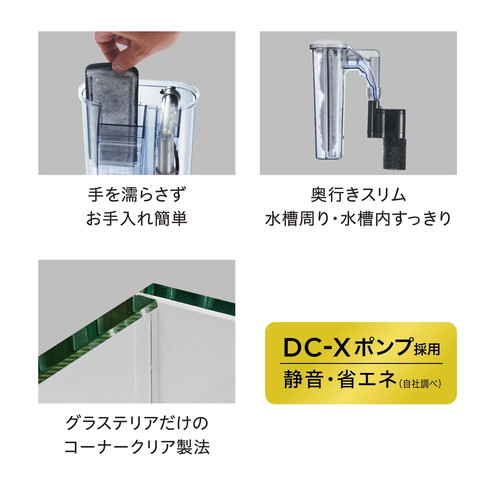DC-Xポンプ採用の静音スリムフィルターをセット。「クリアLEDフラッティ」をセットできる専用フタ付き。すっきり収まる。・グラステリアだけの「コーナークリア製法」・専用の研磨機により芸術的に磨きこまれたエッジ・熟練の技術とクリアシリコンで作る美しいガラスの貼り合わせ・この透明感で水景がインテリアに溶け込む・「透明感」にこだわるグラステリア水槽シリーズ・「クリアLEDフラッティ」をセットできる専用フタ付き※3年保証にはユーザー登録が必要です