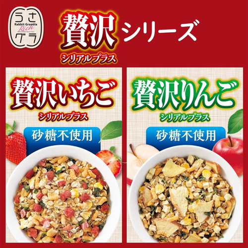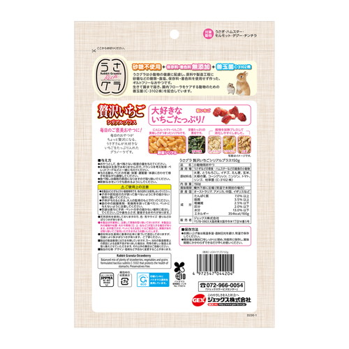 大好きないちごたっぷり!砂糖不使用のおやつです。●うさグラは小動物の健康に配慮し、原料や製造工程に砂糖などの糖類・食塩、保存料・着色料を使用せず作った、ギルトフリーなおやつです。生きて腸まで届き、腸内フローラをケアする動物のための善玉菌(C-3102株)を配合しています。●大好きないちごたっぷり!粒いちご入り。●りんご、トマト、にんじんのおいしさギュッとこだわりシリアル入り。●小麦グルテン不使用、お腹にやさしいオートミール入り。