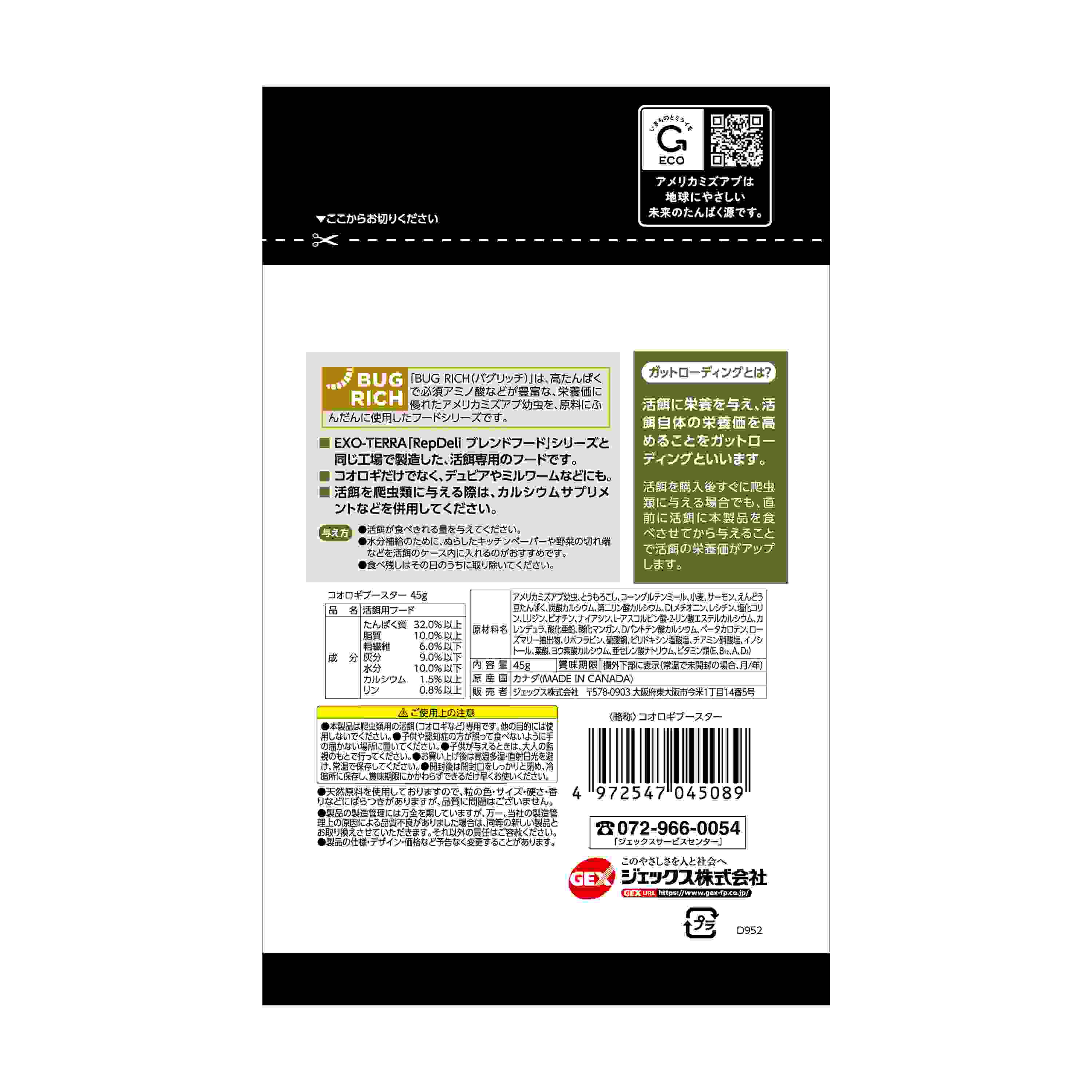 ●「BUG RICH(バグリッチ)」は、高たんぱくで必須アミノ酸などが豊富な、栄養価に優れたアメリカミズアブ幼虫を、原料にふんだんに使用したフードシリーズです。●EXO-TERRA「RepDeli ブレンドフード」シリーズと同じ工場で製造した、活餌専用のフードです。●コオロギだけでなく、デュビアやミルワームなどにも。●活餌を爬虫類に与える際は、カルシウムサプリメントなどを併用してください。●活餌に栄養を与え、活餌自体の栄養価を高めることをガットローディングといいます。活餌を購入後すぐに爬虫類に与える場合でも、直前に活餌に本製品を食べさせてから与えることで活餌の栄養価がアップします。