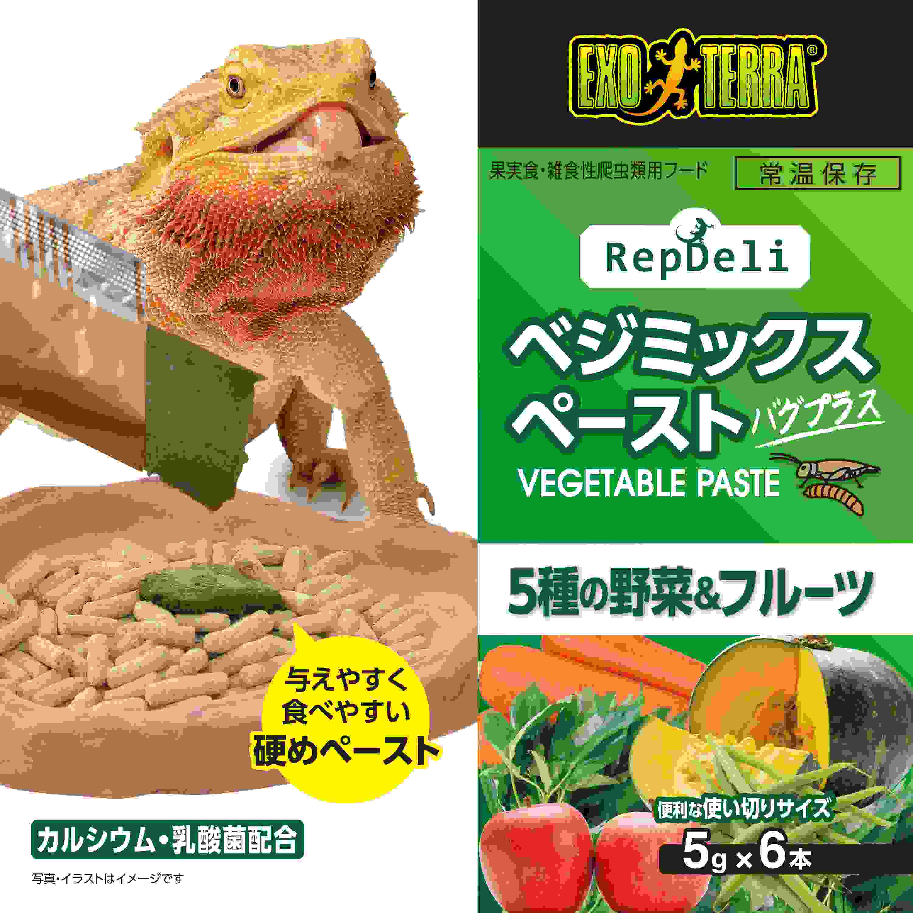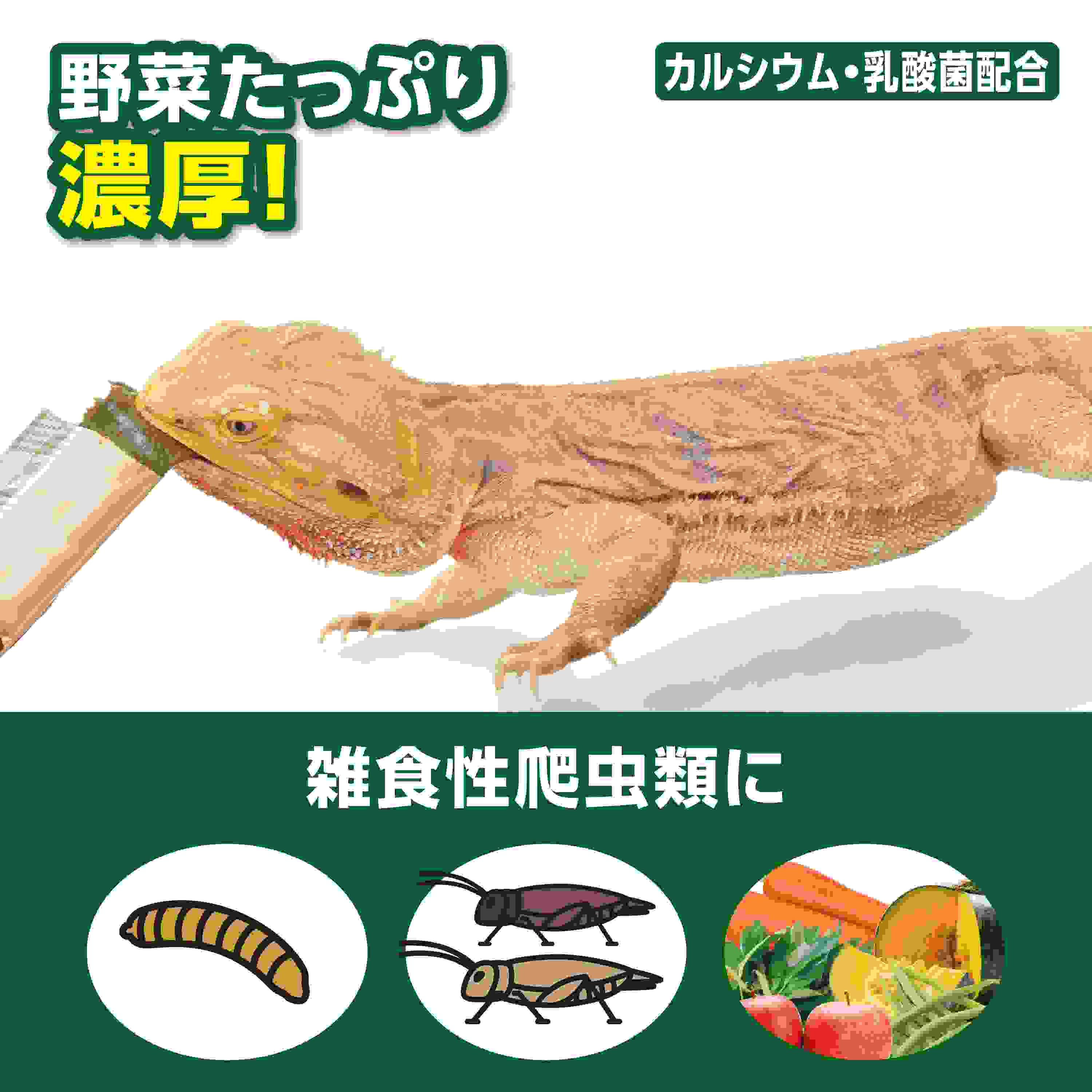 ●栄養たっぷりなニンジン・インゲン・カボチャ・モロヘイヤ・リンゴをミックスした野菜メインのペーストに、嗜好性の高いアメリカミズアブ幼虫・ヨーロッパイエコオロギ・フタホシコオロギをプラス。様々な栄養を摂取でき、雑食性の生体の栄養バランスアップに最適です。●カルシウム配合なので、サプリメント添加不要。●おなかの健康を考えて、乳酸菌配合。●開封してそのまますぐ与えられるペーストタイプ。●対象生体:フトアゴヒゲトカゲ・アオジタトカゲなどの雑食性トカゲ・リクガメ、イグアナ・アガマなどの草食系トカゲの幼体