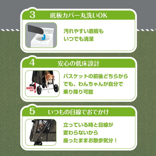 開口部が大きく開く低床バスケットで、わんちゃんが乗り降り可能。低重心で安定感バツグン!底板カバーも丸洗いできます。いつまでも一緒におでかけ!足腰の弱くなったわんちゃんにも最適!1. 低重心で安定感抜群!・・・ずっしり中型犬も軽々走行2. 深型バスケット・・・体がすっぽり入ってわんちゃんも安心。体が大きくても快適!3. 底板カバー丸洗いOK・・・汚れやすい底板もいつでも清潔に保てます4. 安心の低床設計・・・わんちゃんが自分で乗り降り可能!5. いつもの目線でおでかけ・・・立っているときと目線が変わらないから座ったままお散歩気分!●スライドロック式レバーで安全性UP!コンパクトに折りたたみ可能●ドリンクホルダーと背面ポケットで荷物すっきり!●飛び出し防止リード2本付き●保冷剤やカイロを入れて温度調節可能な内側ポケット付き●大きなメッシュ窓で通気性抜群●断熱材で地面からの熱を抑制