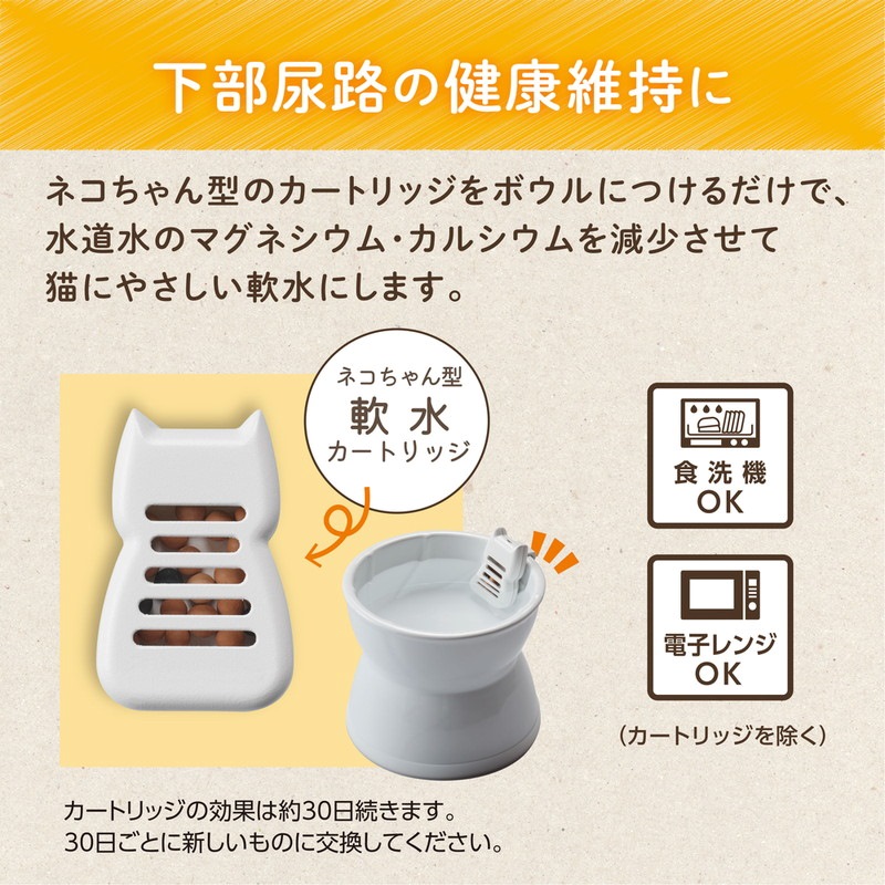 【取り付けるだけで簡単!】 ネコちゃん型のカートリッジをボウルにつけるだけで、水道水のマグネシウム・カルシウムを減少させ、やさしい軟水に! 【自然な姿勢で飲みやすい!】 自然な姿勢で飲みやすい、高さのある脚付きタイプ。 すべり止めシリコン付。 【ニャン水ウェーブ】 ペロペロすると内側のリブによって波が起こり、効率よく軟水に! 内側のリブにより、ネコちゃんがペロペロと舌で水を飲むと自然に波紋が広がります。 これが「ニャン水ウェーブ」となり、飲みやすさをサポートします。 【お手入れ簡単】 カートリッジを取り外して、ボウルは食洗機での清掃が可能です。 電子レンジもOK。 【カートリッジ交換頻度】 カートリッジの効果は約30日続きます。 30日ごとに新しいものに交換してください。