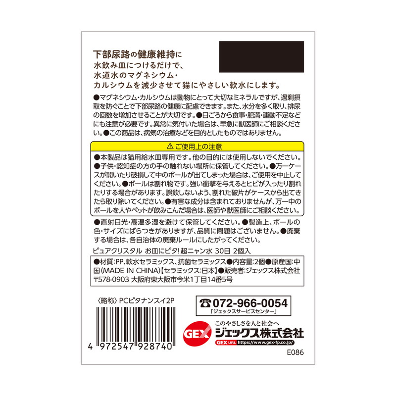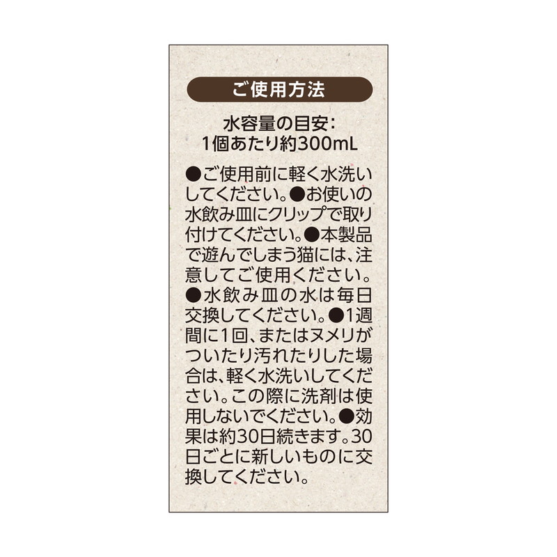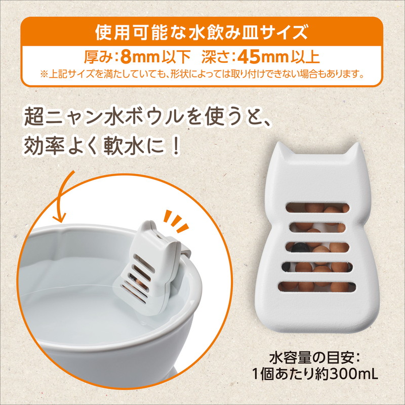 超ニャン水ボウルやお皿に取り付けるだけ、ピタッと固定。 いつものお水をカラダにやさしい軟水に! 軟水セラミックボールで、水道水のマグネシウム・カルシウムを減少させてやさしい軟水にします。 【使用可能な水飲み皿サイズ】 厚み:8mm以下、深さ:45mm以上 ※本サイズを満たしていても、形状によっては取り付けできない場合もあります。 【水容量の目安】 1個あたり約300mL 【カートリッジ交換頻度】 カートリッジの効果は約30日続きます。 30日ごとに新しいものに交換してください。