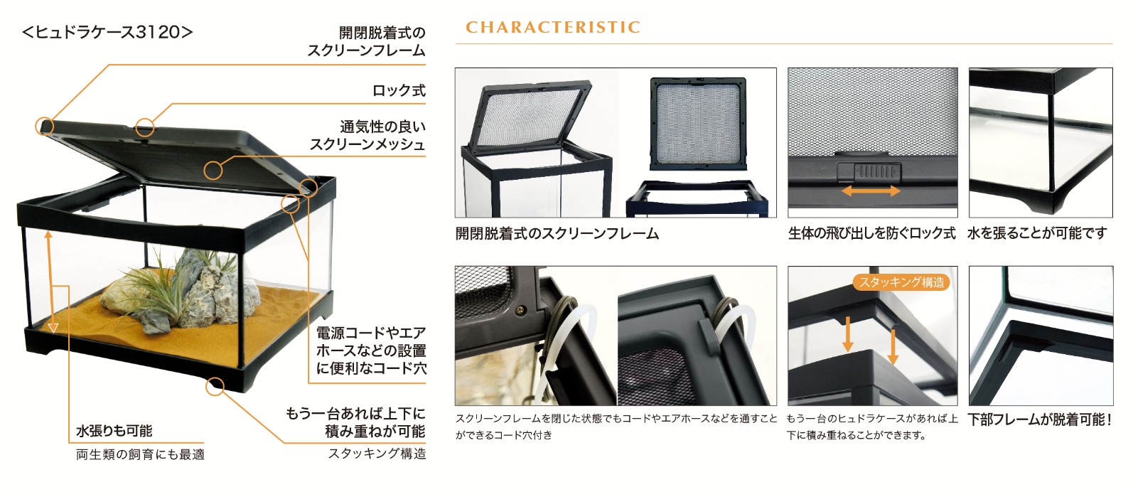 ・爬虫類・両生類飼育に便利な機能が充実!・ハムスターなどの小動物の飼育にも最適!・開閉脱着式スクリーンフレームで通気性、メンテナンス性が抜群!・2台あれば上下に積み重ねが可能です!<セット内容> 専用ガラスケース/スクリーンフレーム<寸法(mm)> W310×D304×H200 <原材料> ガラス、樹脂<カラー展開> ブラック / ホワイト