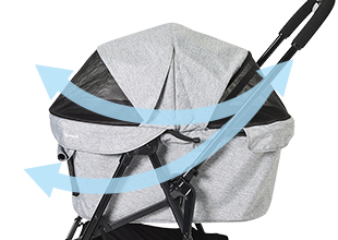 幌の前後は大きく窓を開けることができ、キャリー前後の窓カバーをあければ、合計3ヶ所で通気することができます。