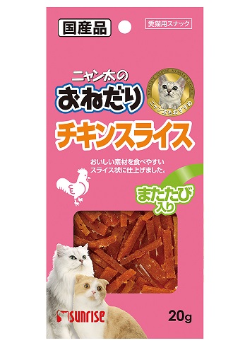鶏肉の中でも特に低脂肪な鶏ササミを使用しネコちゃんの大好きなまたたびを配合した、嗜好性の高いスナックです。