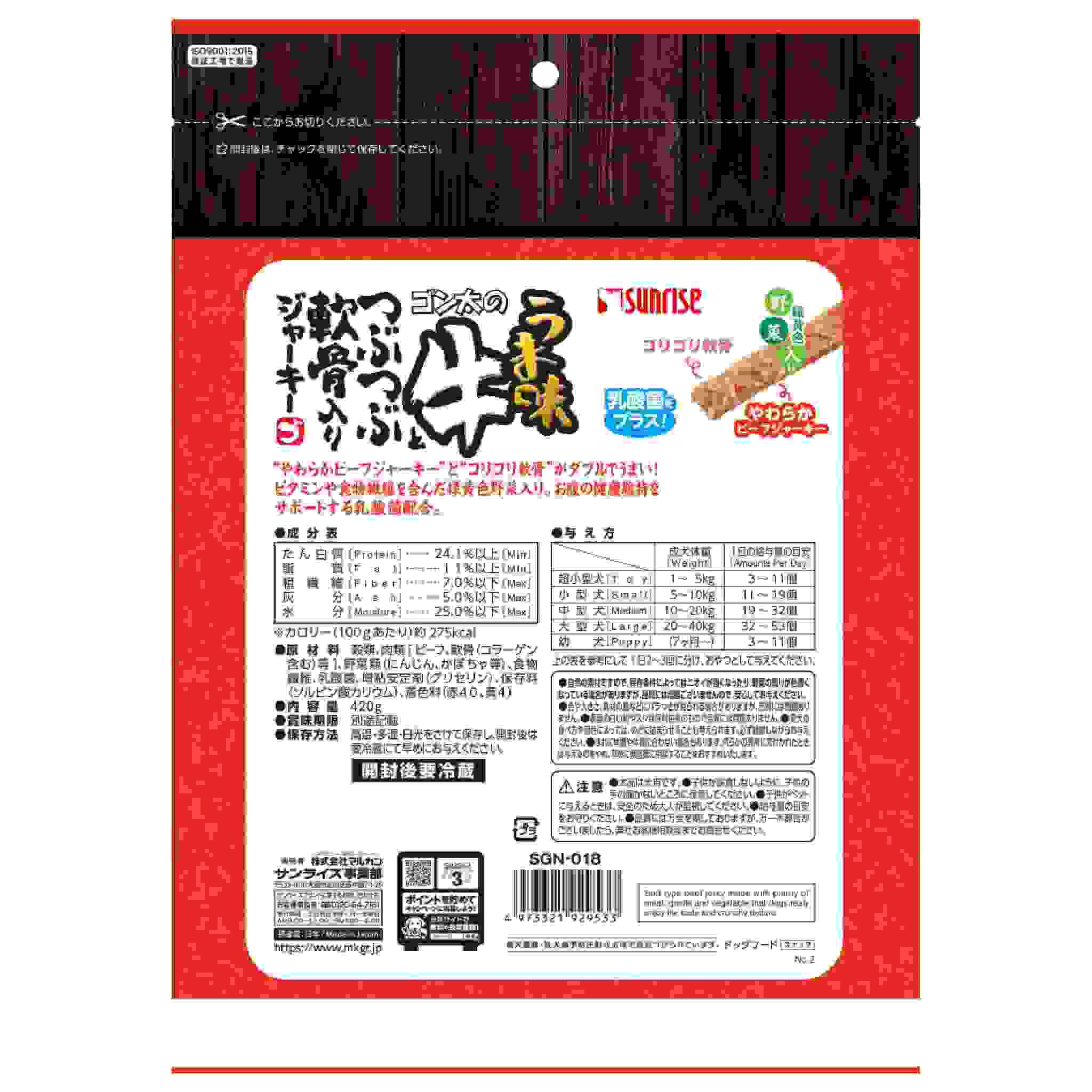 お肉をたっぷり使ったビーフジャーキーのおいしさと軟骨のコリコリした食感がダブルで味わうことができる嗜好性の高いスナックです。
