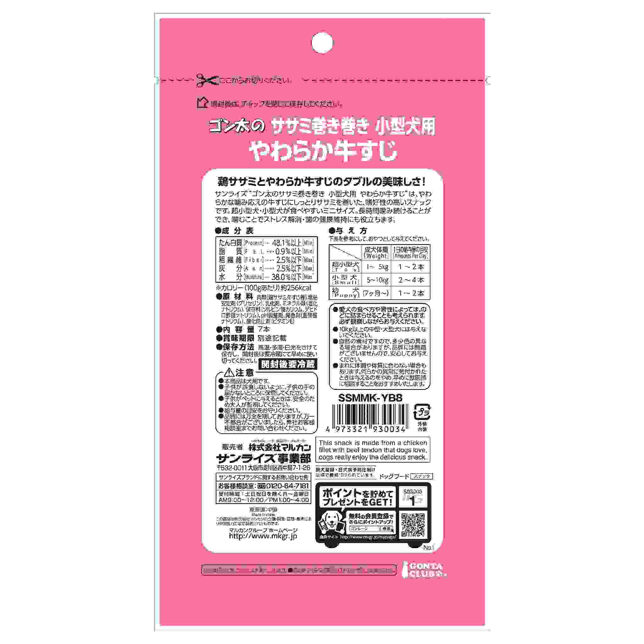 やわらかな噛み応えの牛すじにしっとりササミを巻いた、嗜好性の高いスナックです。超小型犬・小型犬が食べやすいミニサイズ。長時間噛み続けることができ、噛むことでストレス解消・歯の健康にも役立ちます。